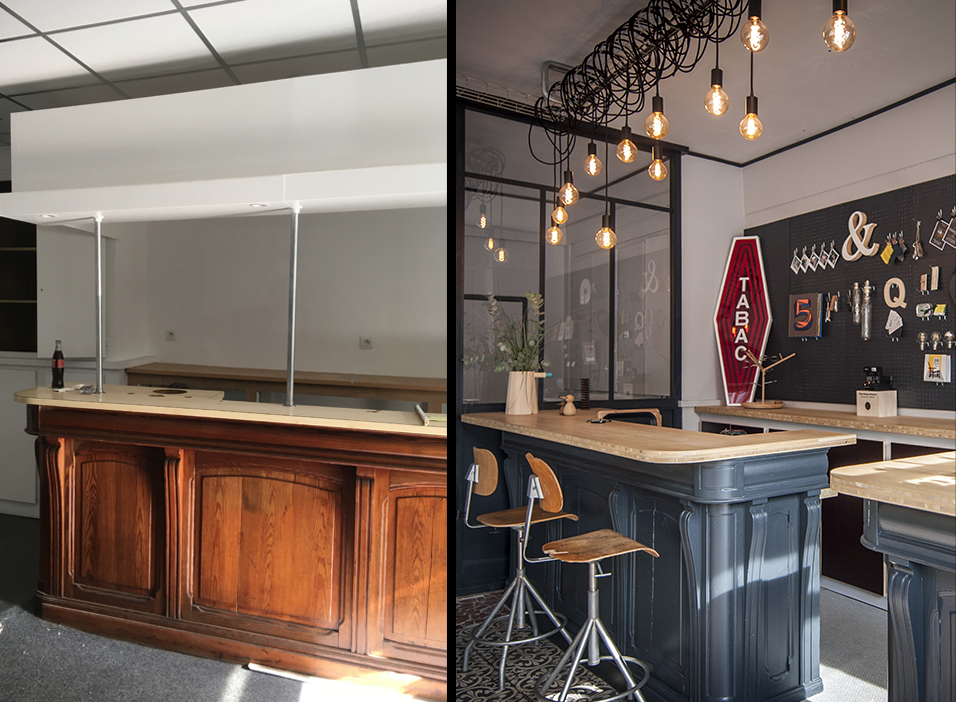 Le bar en pichepin de 1926 a été souligné par une peinture anthracite pour contraster avec le sol et rehaussé d’un plateau chêne chaleureux. Espace rassembleur et convivial, il permet de travailler autrement et/ou d’accueillir petit déjeuner et déjeuner d’équipe.